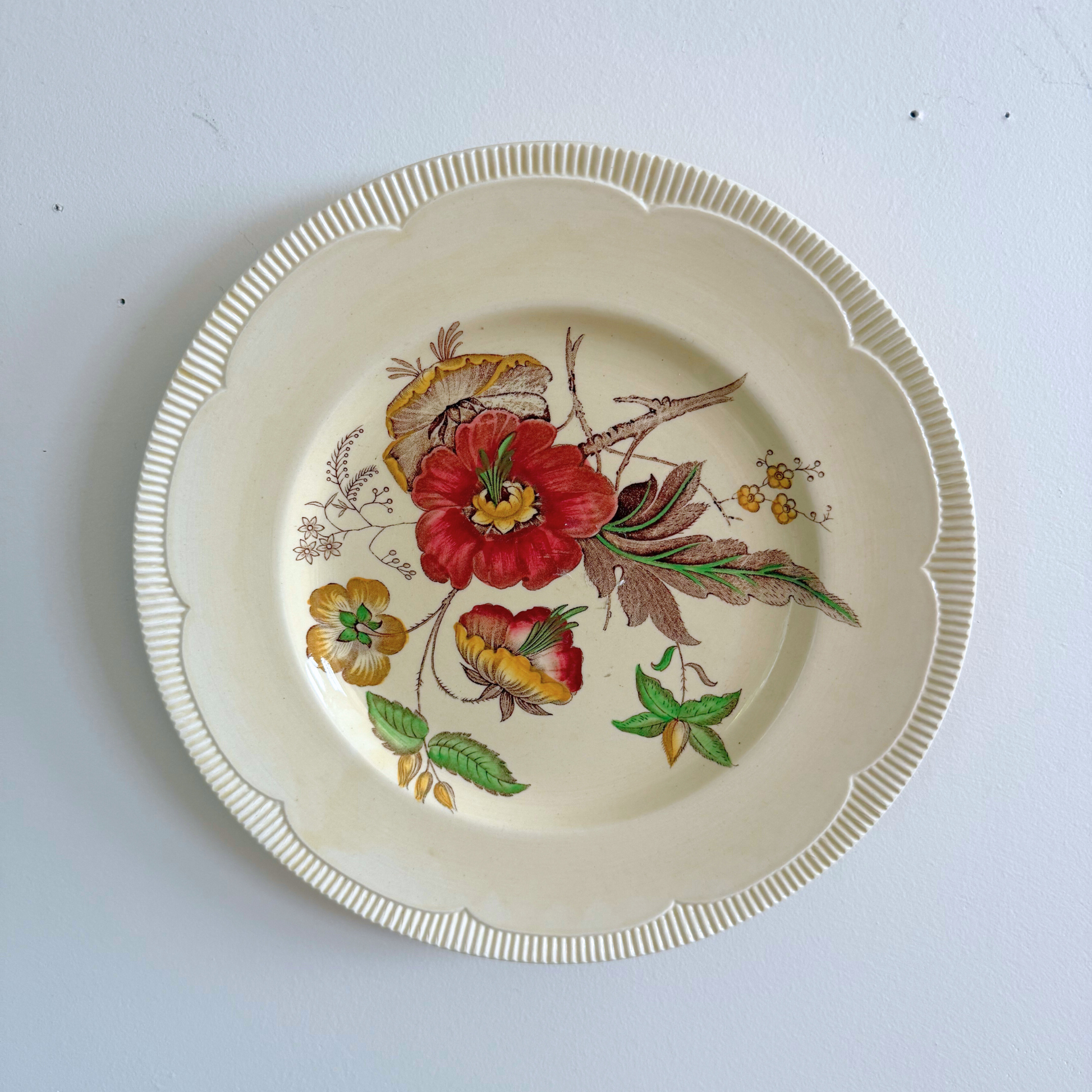 botanical cottage gallery wall, Clarice Cliff floral plate, silk painting wall art, midcentury floral painting, Paris riverscape lithograph, European cottagecore décor, vintage curated wall art, pre-styled gallery wall set, nature-inspired vintage wall, storybook wall décor, floral pottery wall art, signed Helgason painting